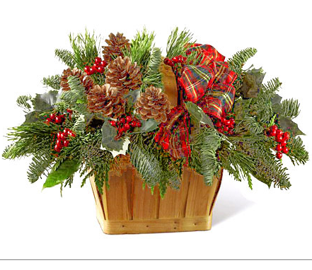ウインターグリーンとマツカサのクリスマスアレンジメント。日持ちが良いので、長くお楽しみいただけます。