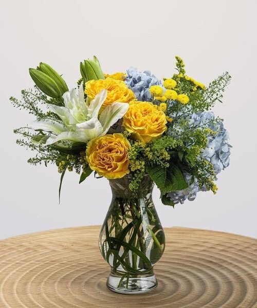 明るいイエローとブルーの花々が、太陽を追いかけるような爽やかな彩りを、ご自宅や大切な方のもとへお届けします。春の季節にぴったりのラグジュアリーなアレンジメントは、記念日や誕生日、あらゆる特別なシーンを華やかに演出します。