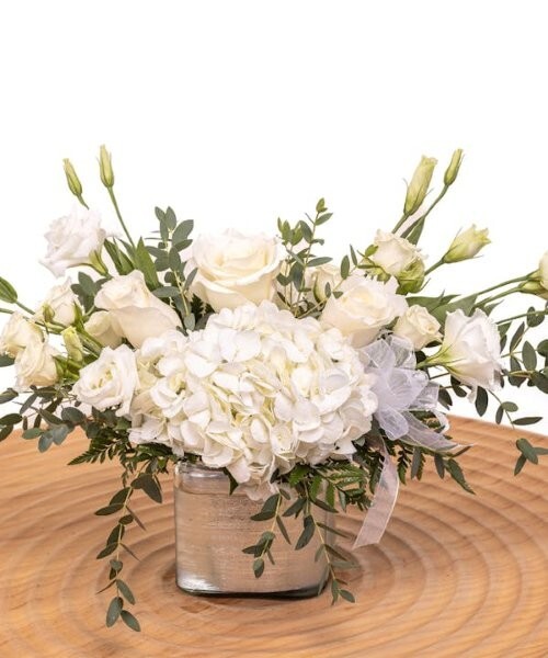 白バラ、トルコキキョウ、アジサイを、シルバーがかったユーカリと繊細なリボンアクセントとともに、シックなガラスキューブベースに優雅にアレンジしました。