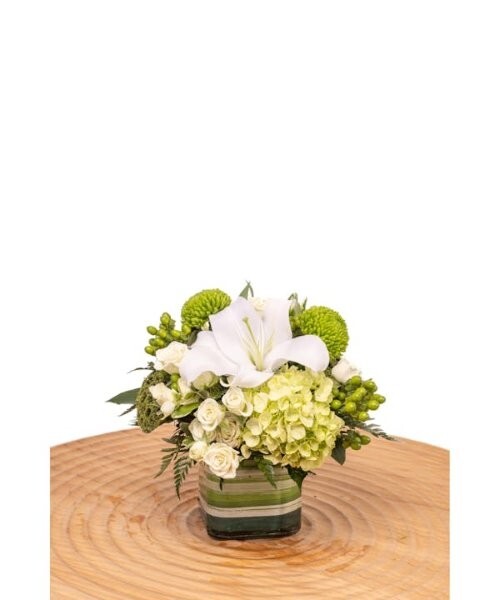 上品な白ユリを中心に、グリーンのアジサイ、ヒペリカムベリー、ポンポン咲きのクッションマムをあしらい、豊かさと静けさを兼ね備えた印象に仕上げました。