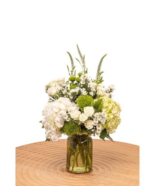 グリーンのアジサイ、ホワイトのスプレーバラ、グリーントリック、ボタンポンポンマムを、軽やかなベロニカと豊かなグリーンとともに、バランスよくアーティスティックに仕上げています。