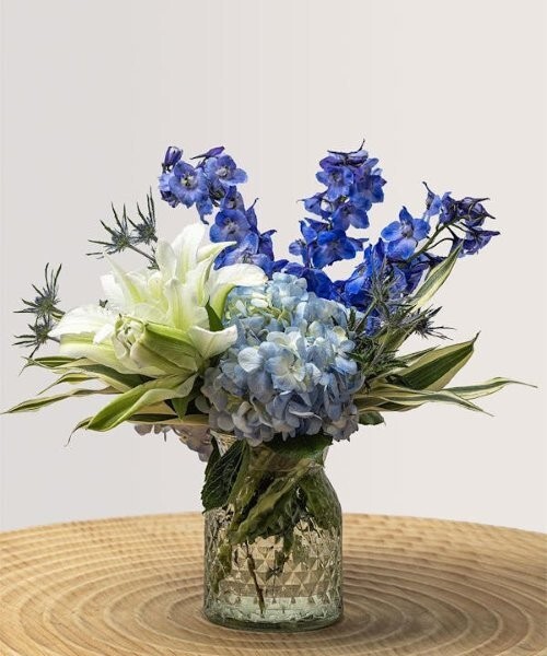 深みのあるブルーとホワイトの花々が、知性と安らぎを象徴し、お誕生日や記念日、特別な日にはもちろん、普段のちょっとした贈り物にもぴったりです。