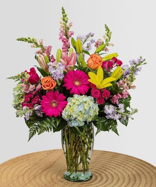あじさい、ユリ、バラ、スプレーバラ、ガーベラ、キンギョソウ、ストックを贅沢に組み合わせ、高さのあるガラスベースに華やかにアレンジしました。