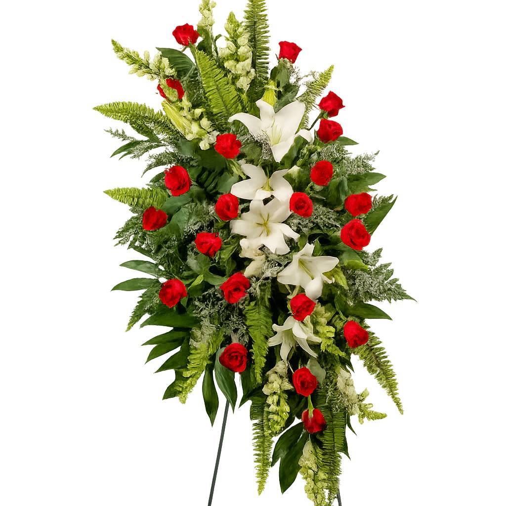 熟練のフローリストが心を込めて手作りするこの葬儀用スタンド花は、悲しみのひとときにそっと寄り添い、慰めと安らぎをお届けします。