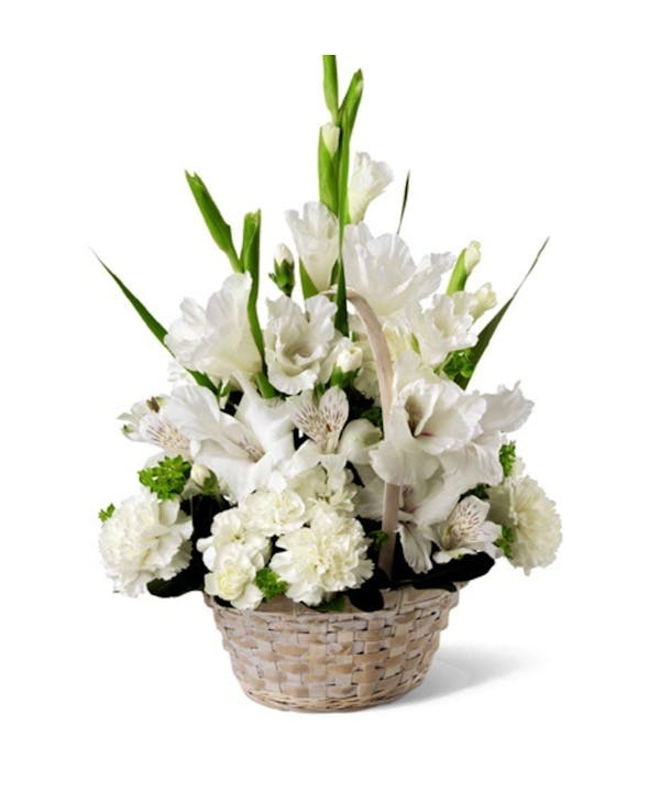 穏やかな白を基調とした花々をナチュラルなバスケットにアレンジした、人気のテーブルフラワーです。心からの想いと哀悼の気持ちをやさしくお届けします。
