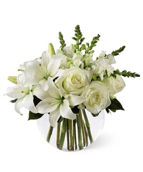 清楚な白を基調とした花々を、丸みのある花瓶に美しくまとめたクラシックなブーケです。愛情や祝福、感謝、いたわりの気持ちを上品に伝えます。